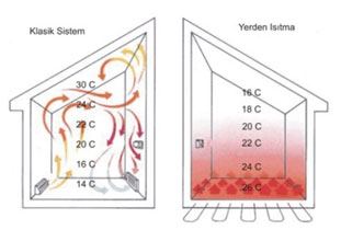 Yandaki şematik resimde radyatörle ısınma ve yerden ısıtma ile ısınmadaki hava sirkulasyonu gösterilmektedir.